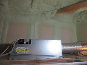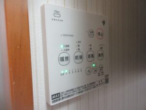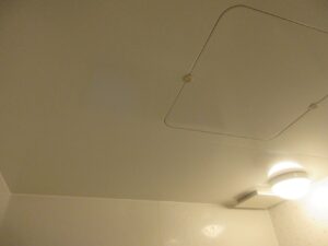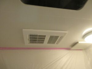 既設換気扇は照明に近過ぎるのでそのまま残し、新たに天井開口して浴室換気乾燥暖房機を取付けました。